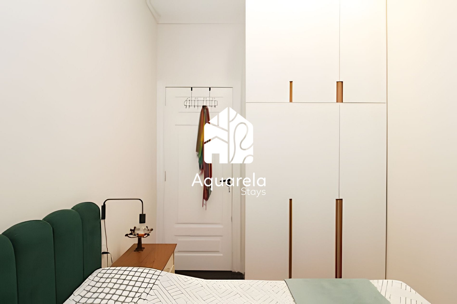 1 quarto silencioso com cama de casal e ar-condicionado Sala com sofá-cama confortável Cozinha equipada com utensílios e eletrodomésticos Banheiro com ducha forte e aquecimento Iluminação inteligente por comando de voz Wi-Fi de alta velocidade Vaga de garagem privativa Prédio com portaria das 7h às 22h Elevador original com porta pantográfica
