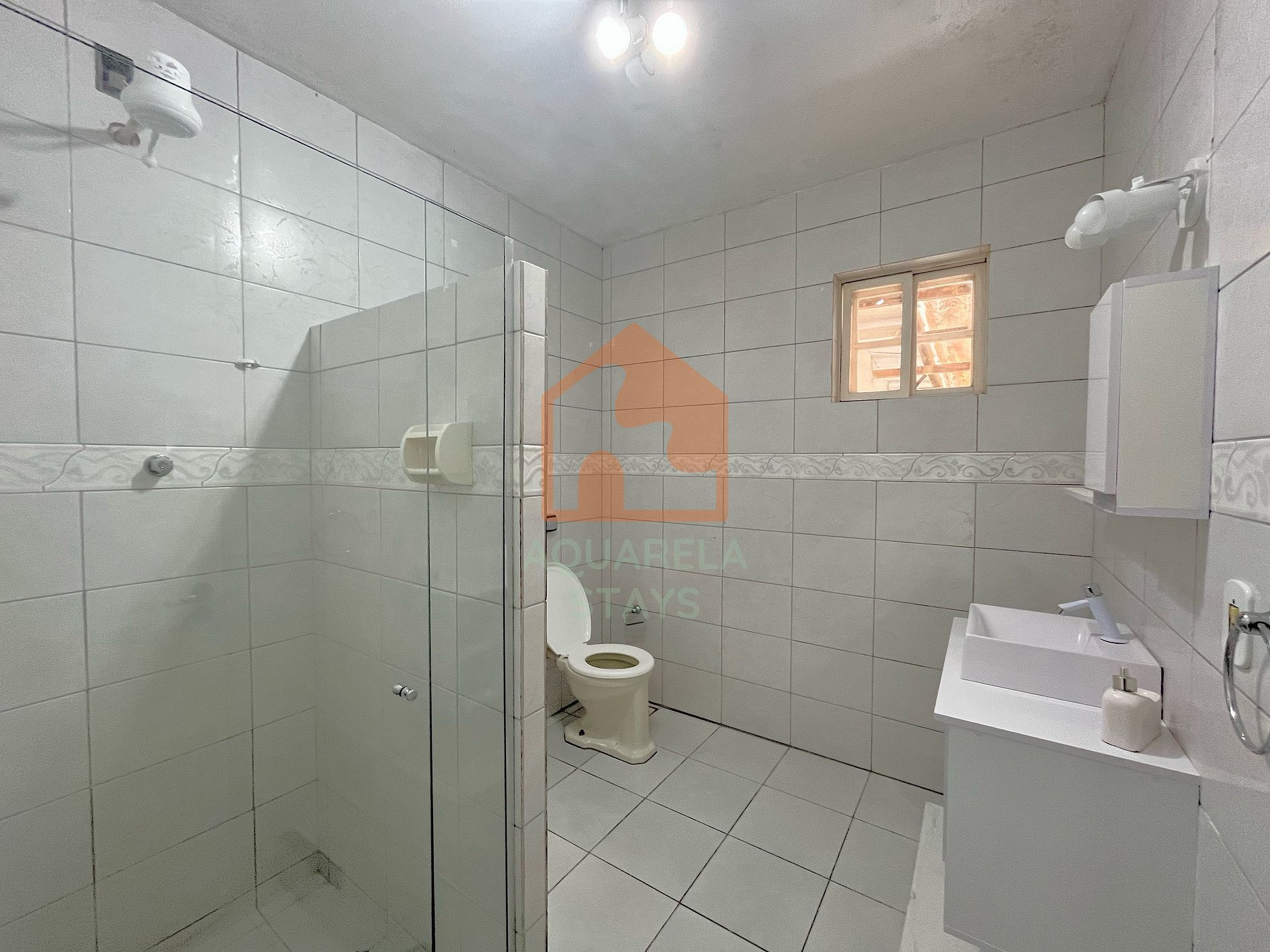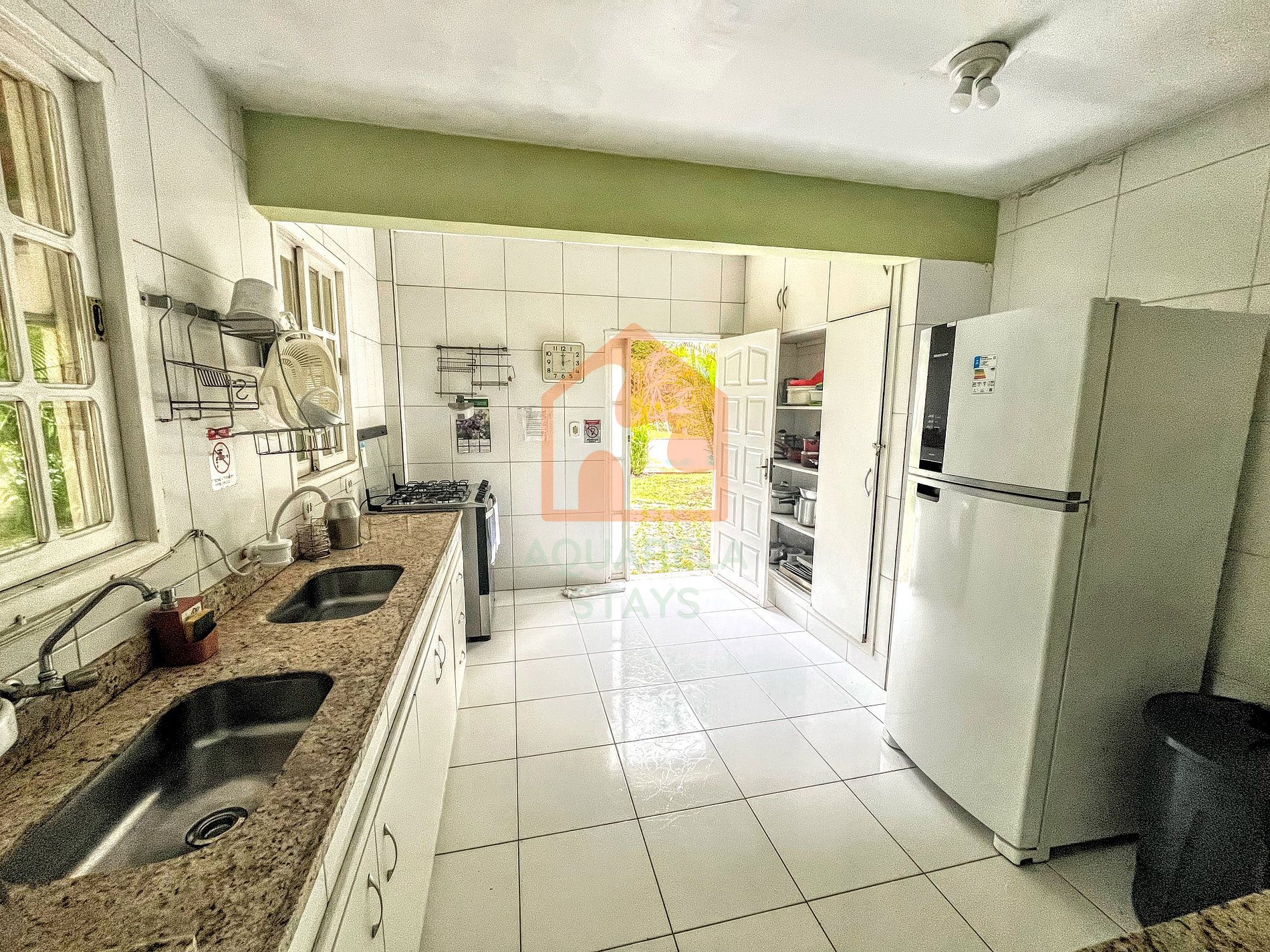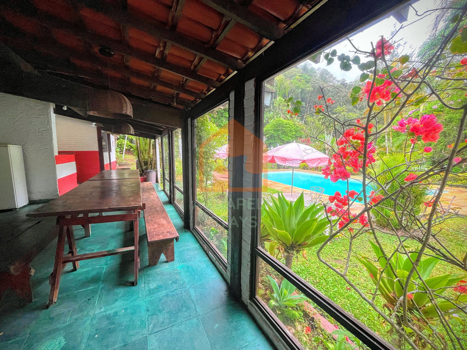 Não entrar na parte central da casa molhado de cloro da piscina, somente na cozinha e copa, temos ducha na área externa;