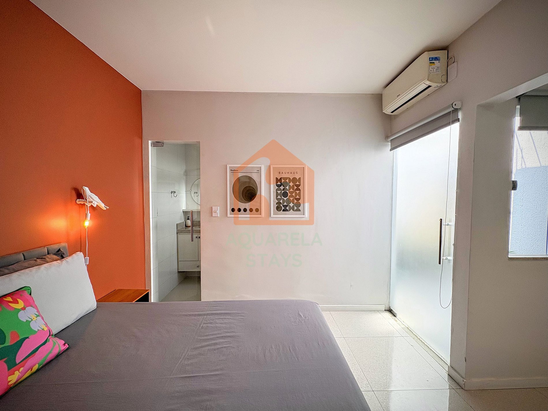 1 Quarto Principal: Cama de casal com colchão magnético; Ar condicionado para o máximo conforto; Suíte completa com chuveiro elétrico; Duas saídas que conectam diretamente à sala de estar e ao jardim de inverno.