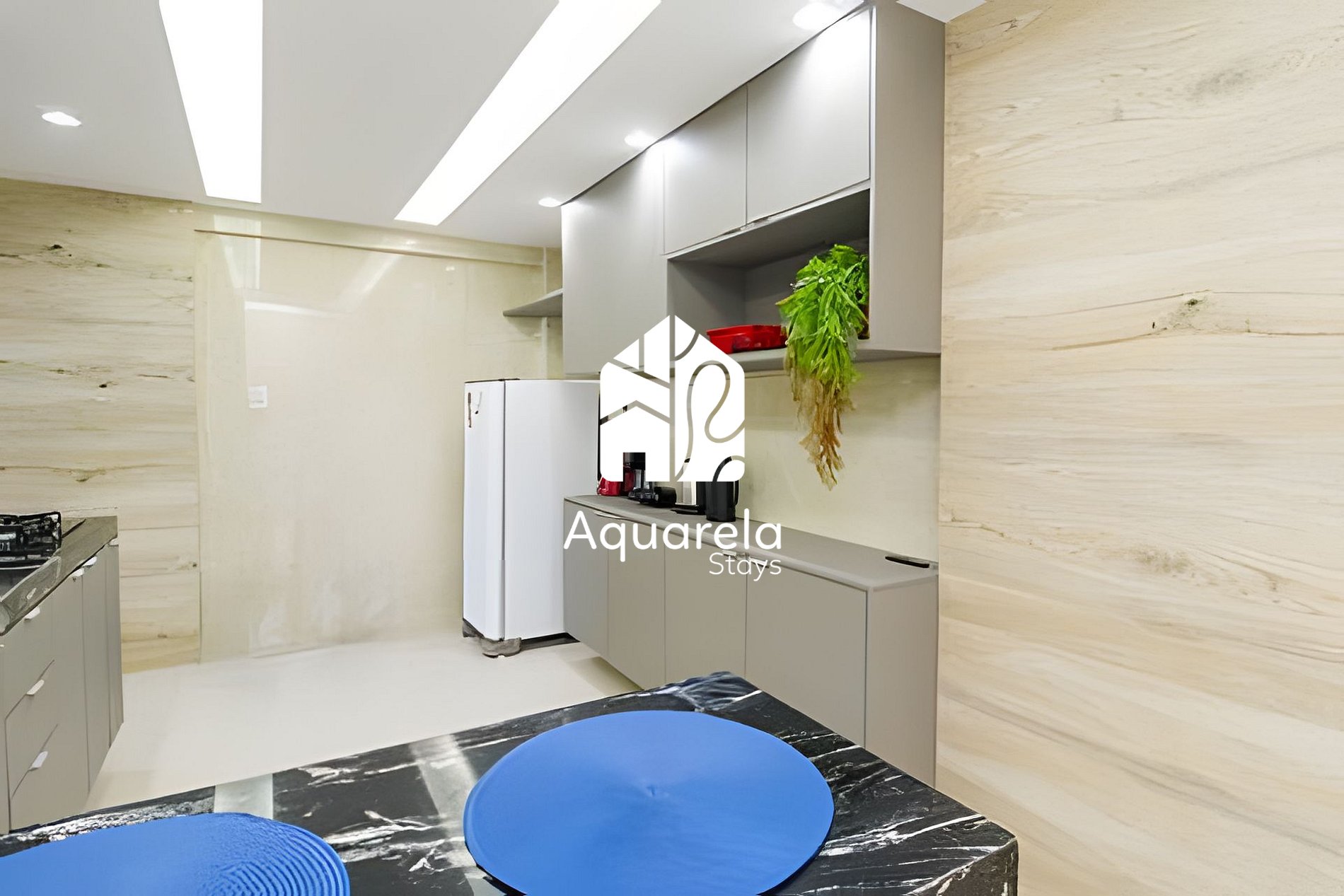A área social integra sala de estar, jantar e lavabo, tudo climatizado e decorado com bom gosto. Na sala, Smart TV para curtir seus filmes e séries. A cozinha é funcional, equipada com utensílios básicos para preparar refeições com praticidade.