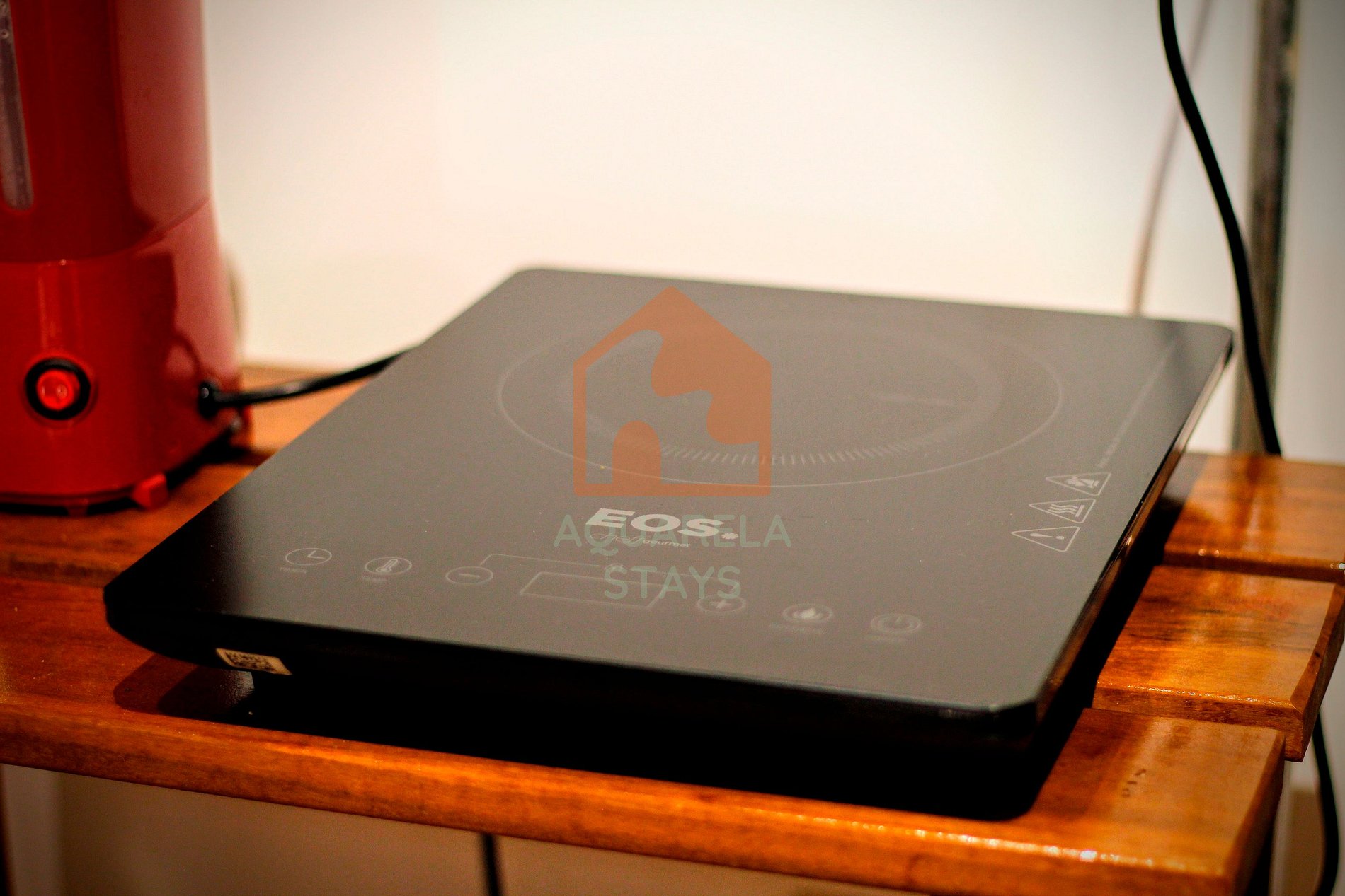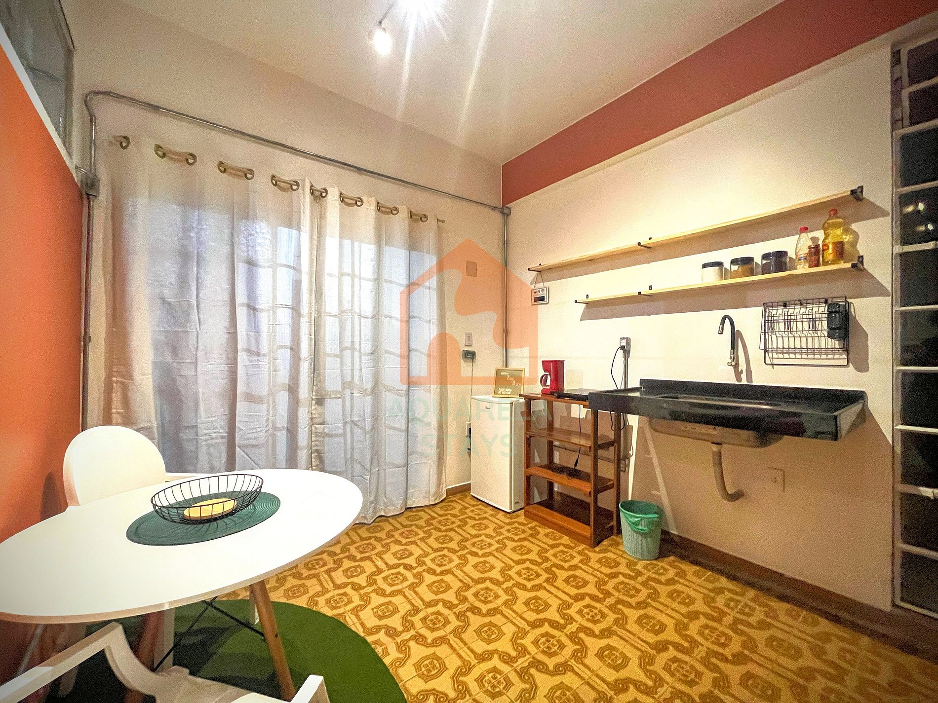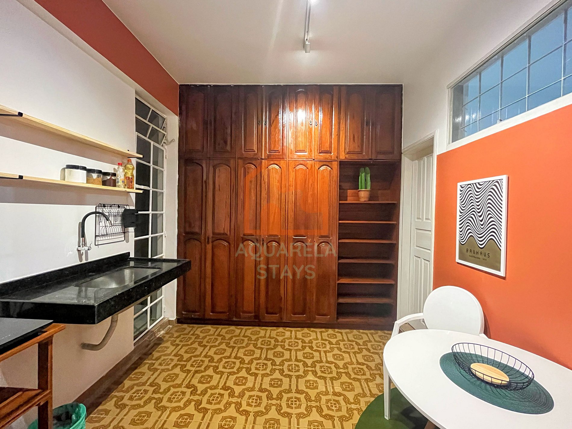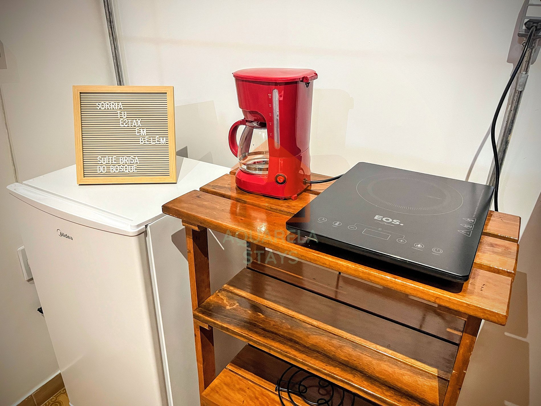 - Copa com espaço para refeições, pia, frigobar, fogão de indução uma boca, cafeteira, liquidificador, panelas e utensílios de cozinha e um ventilador