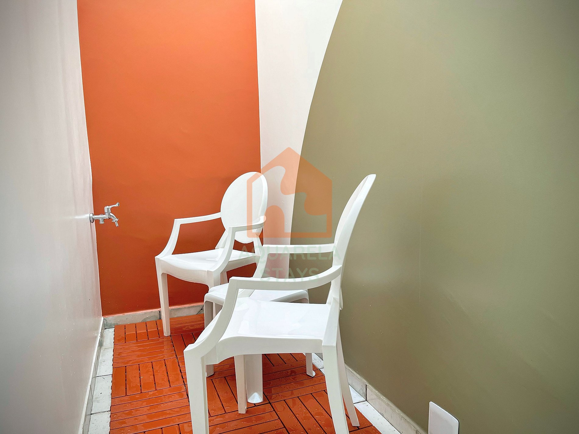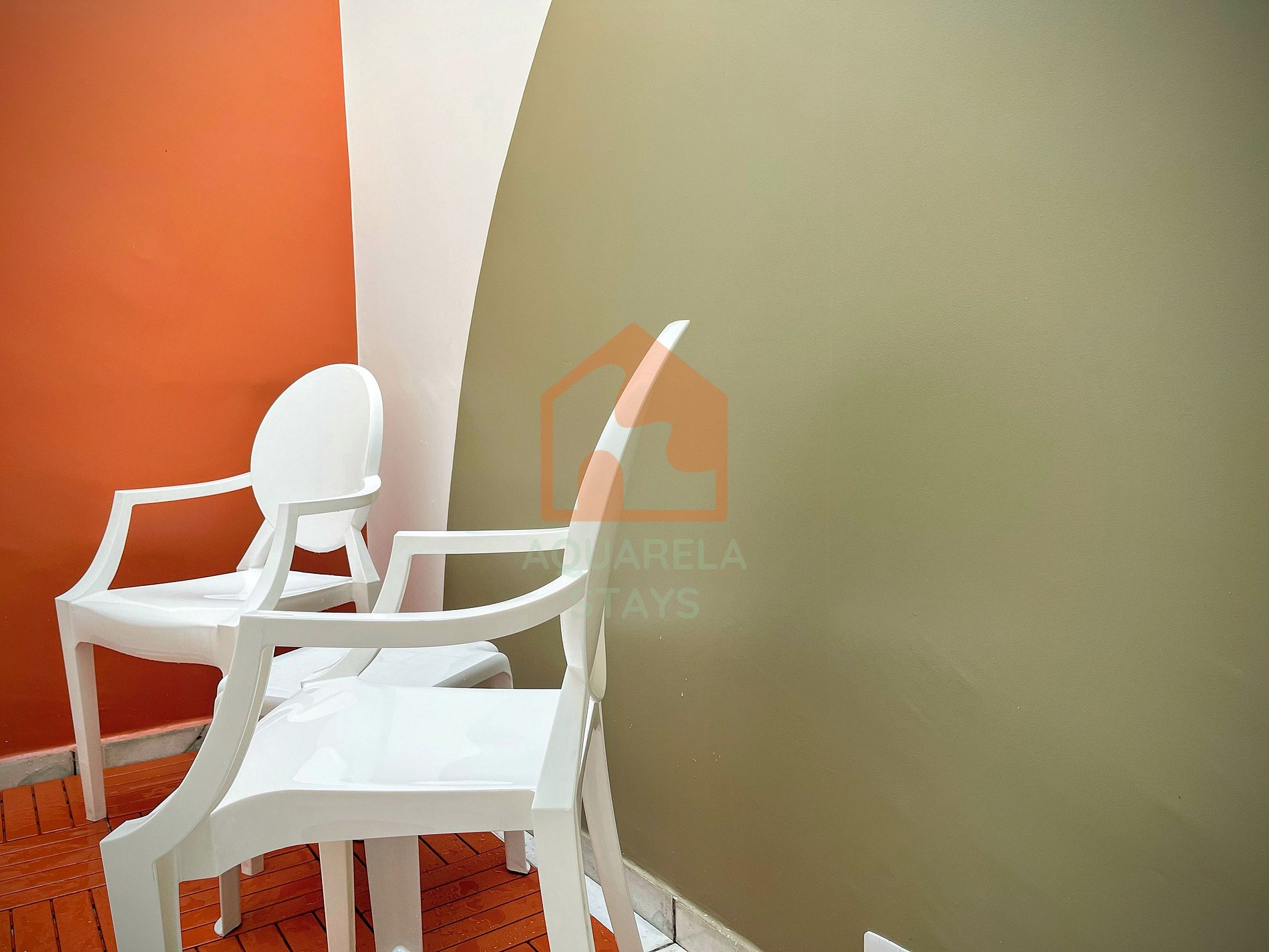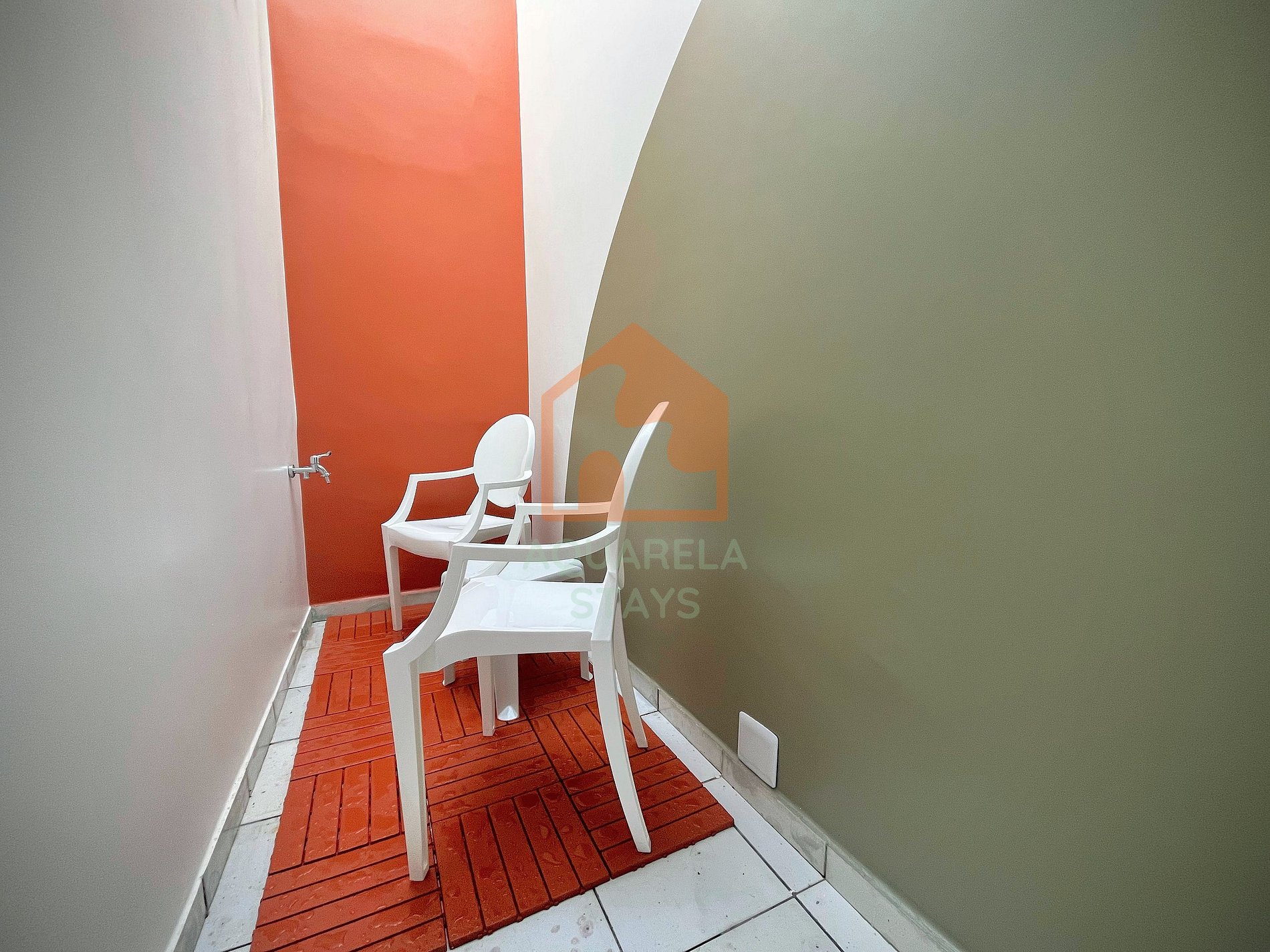 - Jardim de inverno com duas cadeiras e uma mesinha para aproveitar a brisa da noite e para ventilação