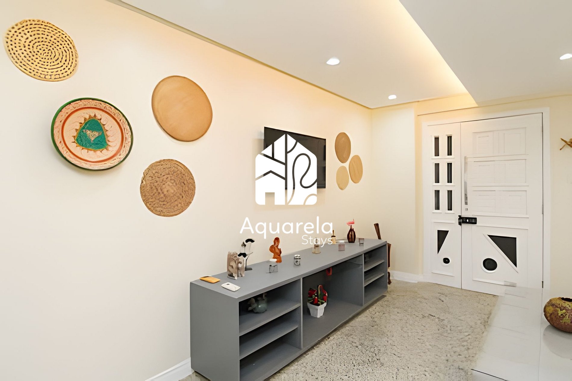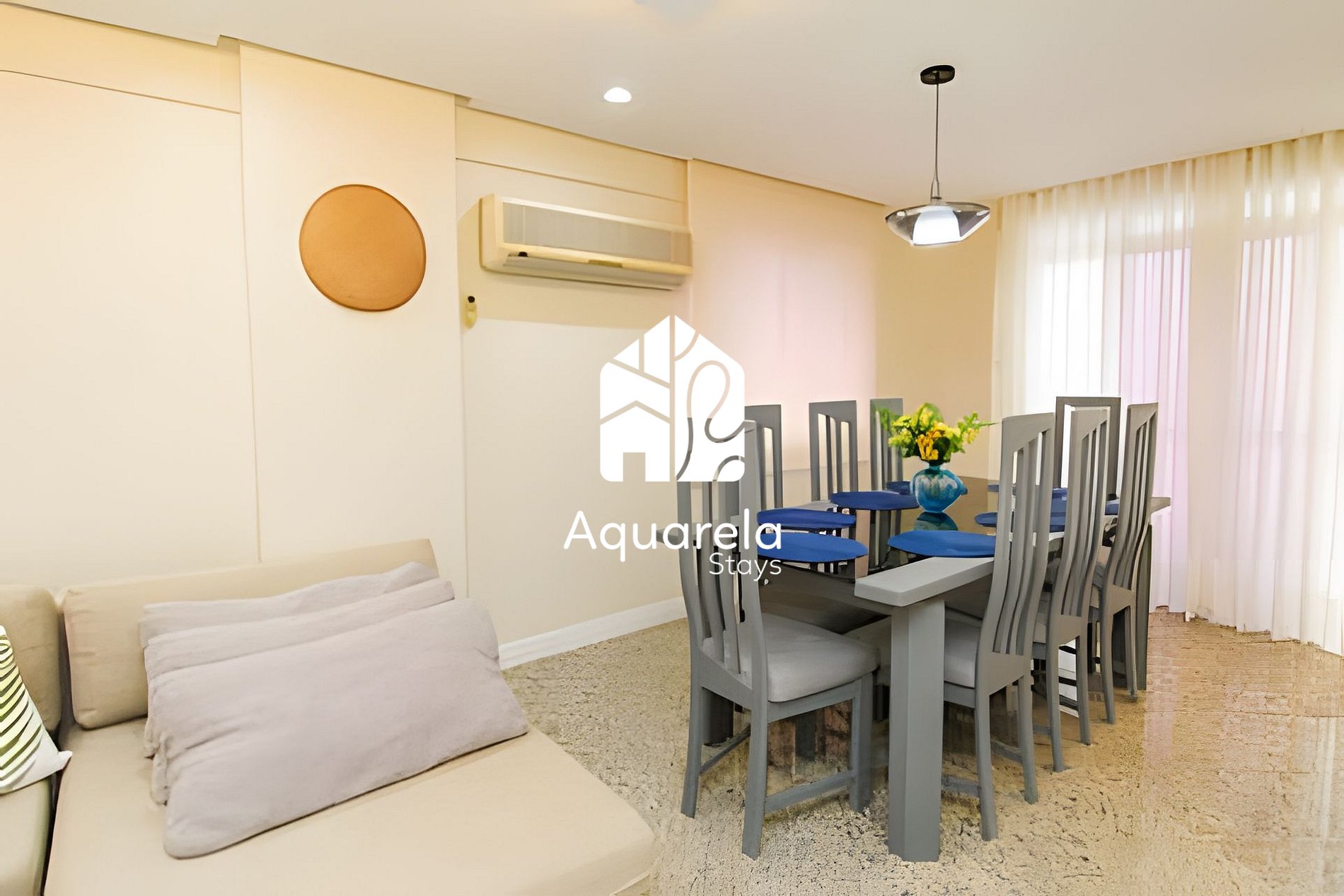 Ideal para famílias, grupos ou viagens a trabalho, o apartamento conta com 3 quartos confortáveis (sendo 1 suíte) + dependência completa, todos com ar-condicionado split, TVs, armários e enxoval de primeira linha. A dependência de serviço também é equipada e oferece total conforto para quem viaja com apoio ou precisa de mais privacidade.