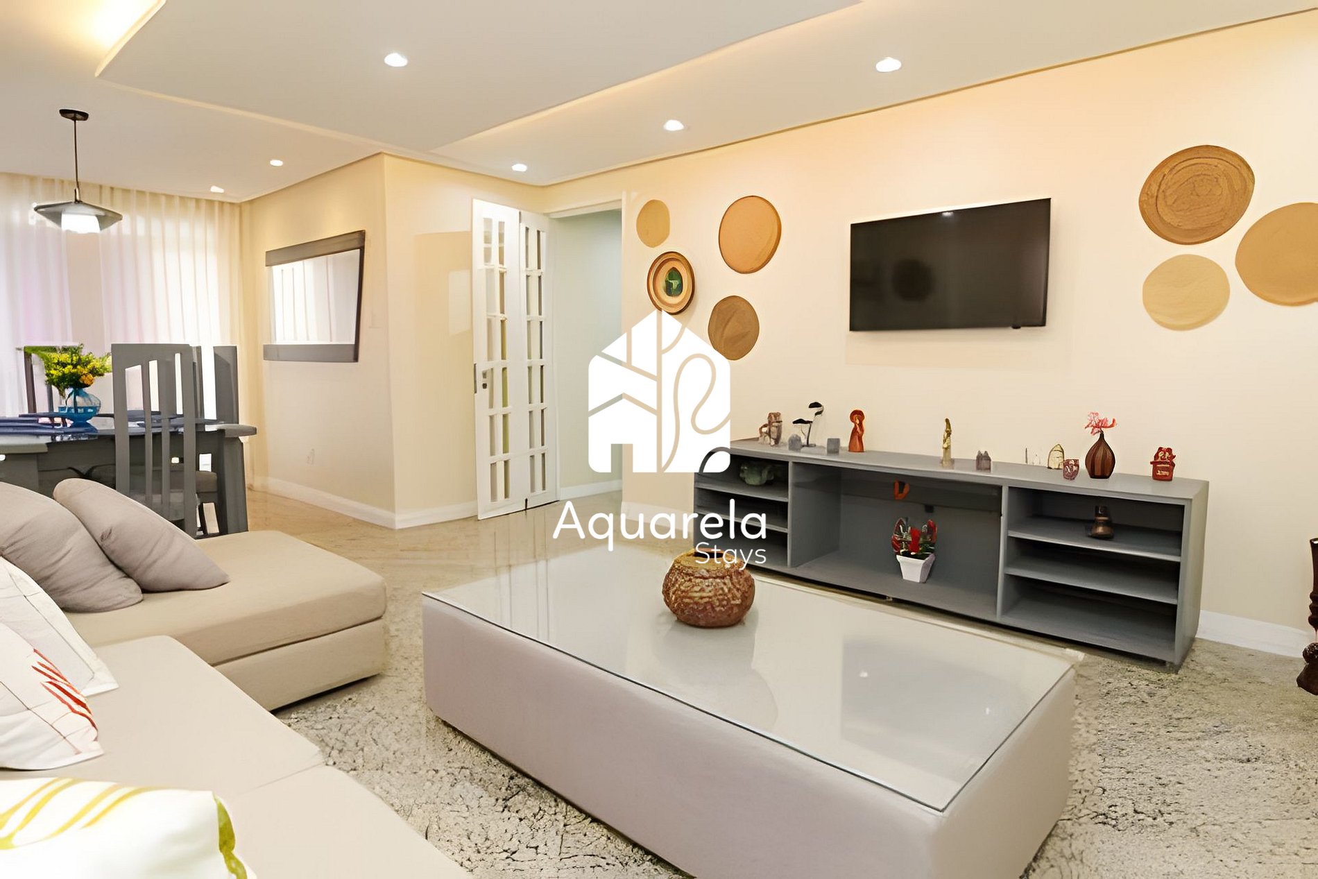 Ideal para famílias, grupos ou viagens a trabalho, o apartamento conta com 3 quartos confortáveis (sendo 1 suíte) + dependência completa, todos com ar-condicionado split, TVs, armários e enxoval de primeira linha. A dependência de serviço também é equipada e oferece total conforto para quem viaja com apoio ou precisa de mais privacidade.